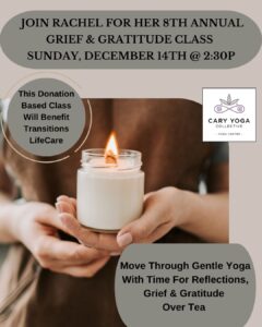 Please join us for The 8th Annual Donation Class to benefit Transitions LifeCare with Rachel Manetti.In Grief and Gratitude: An All-Levels Gentle Yoga Class & Share Session is …