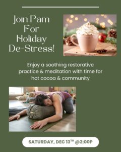 Join Pam For A Special Holiday De-Stress Class! Holidays can be great fun! But even the good kind of stress can build up in the body. Come relax and recharge with Pam! Engage in a …